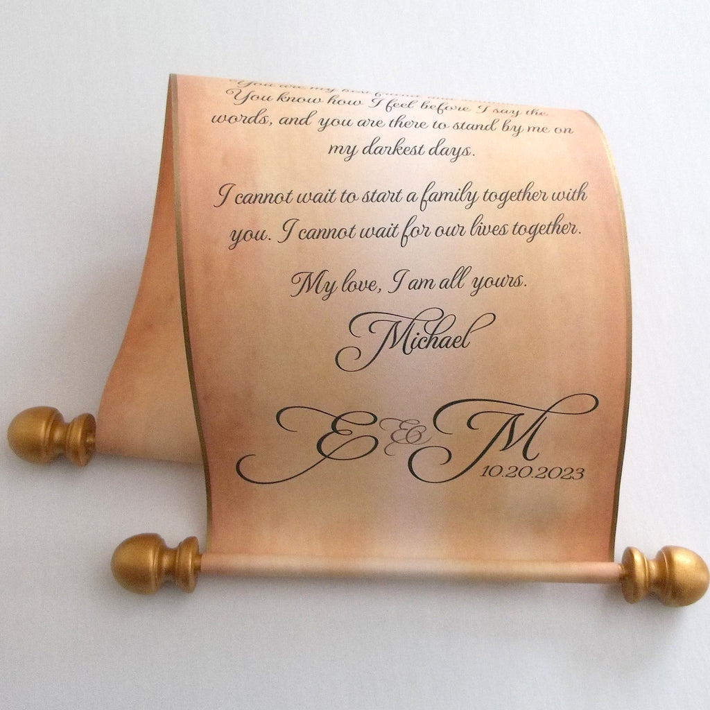 Scroll printed with your own wording, perfect for your wedding vows, marriage proposal, birthday letter, personal note of thank you, or small gift. Set includes a black gift box with a small paper band and ribbon.