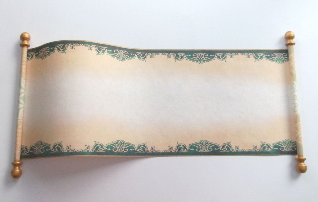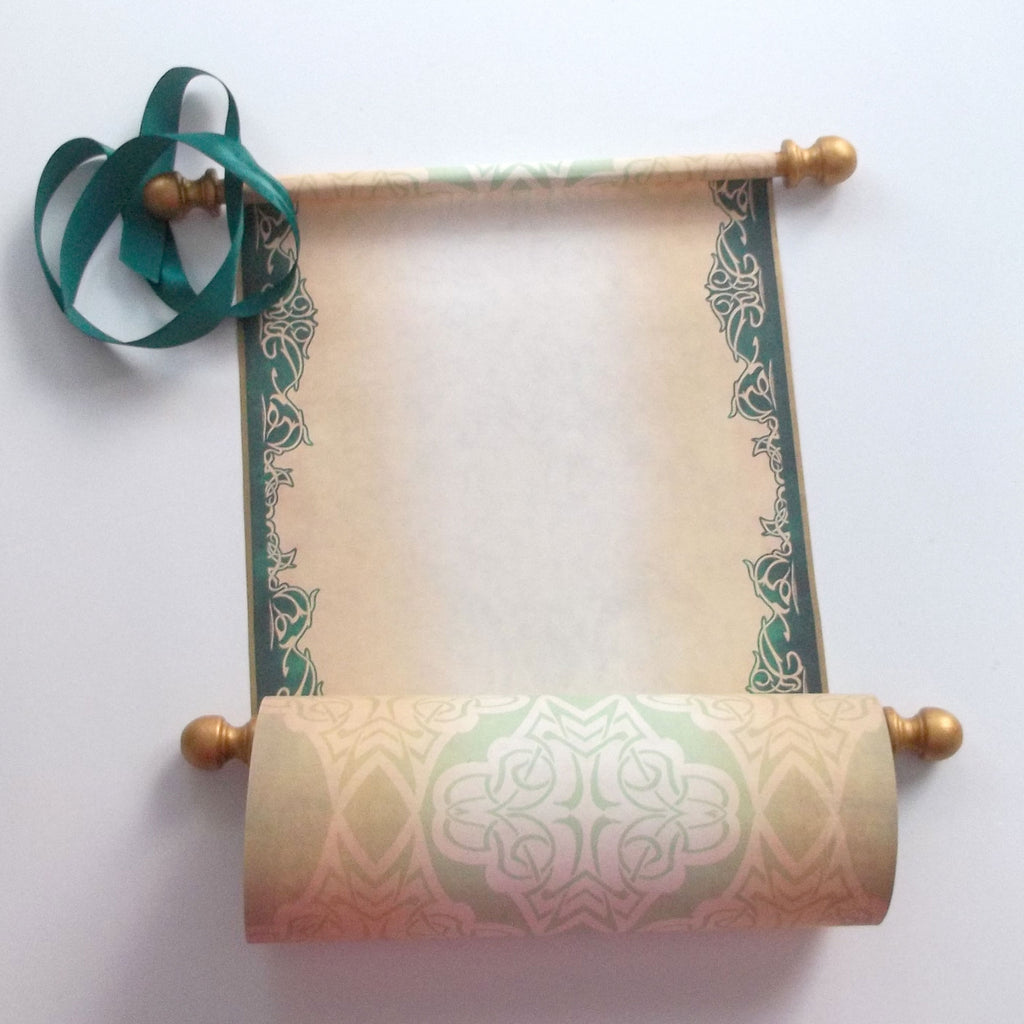 One handmade scroll with ribbon and optional brooch. Aged look parchment paper measures 8" wide by up to 20" long and is blank for your hand writing or hand calligraphy. Overall width of scroll is about 10.50". Scroll has hand painted gold wooden finials and sturdy 3/8" dowels. Scroll is made of 80lb parchment paper.