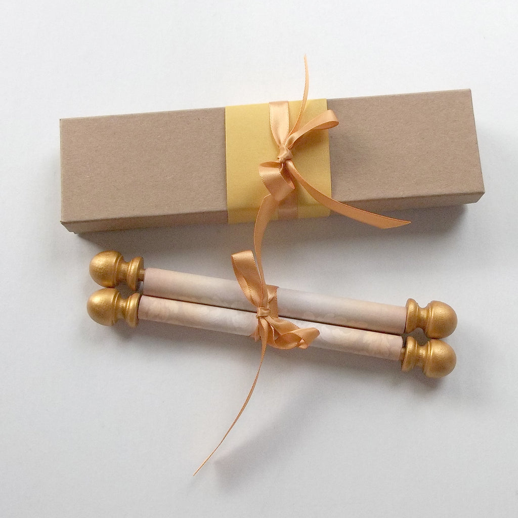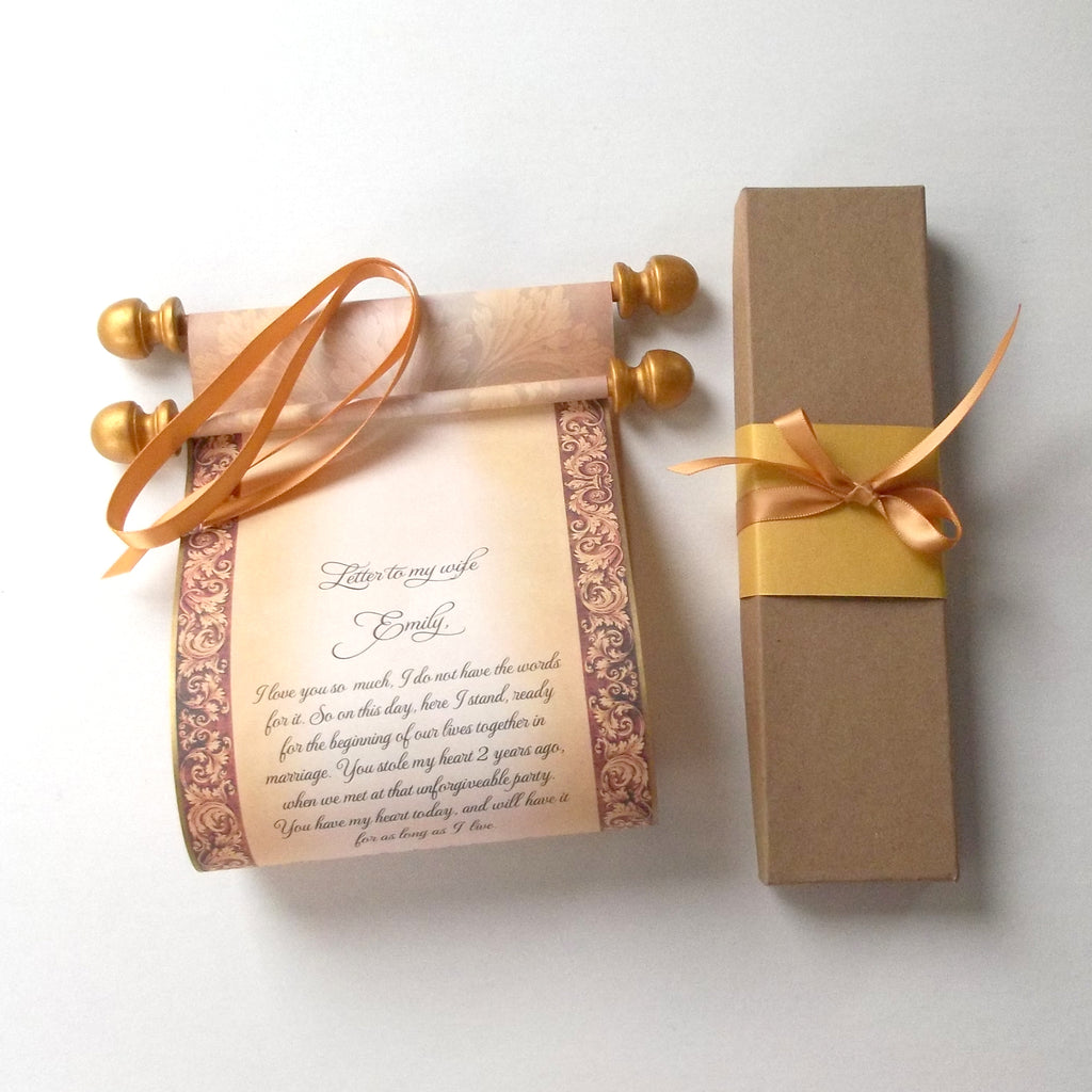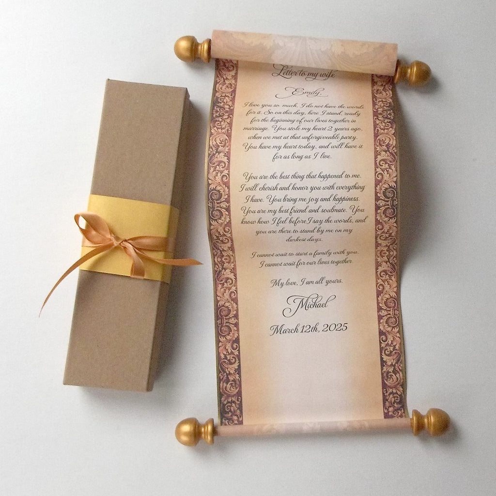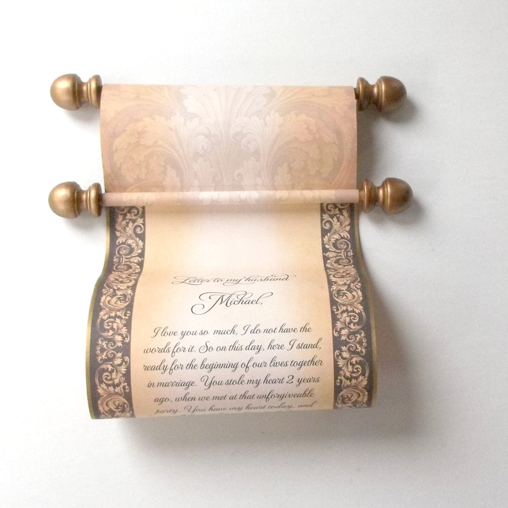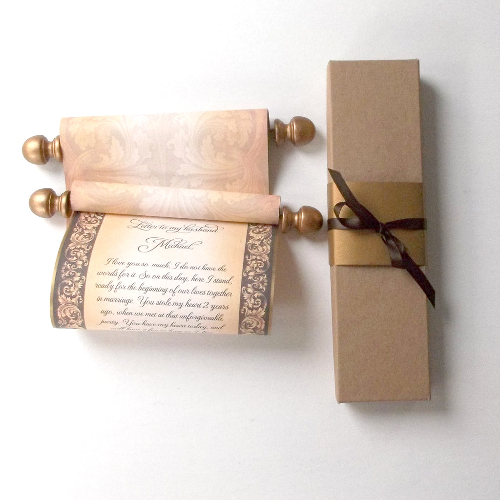 Please choose one scroll or a set of two. Scroll will be tied with a satin ribbon. Gift box measures 8x2x1" and comes with a band and ribbon. Overall width of scroll is about 7.75". Aged look decorative paper measures 5" wide by up to 12" long and will accommodate about 1,200 - 1,500 characters depending on spacing and font style, or about half a page of a letter size document.