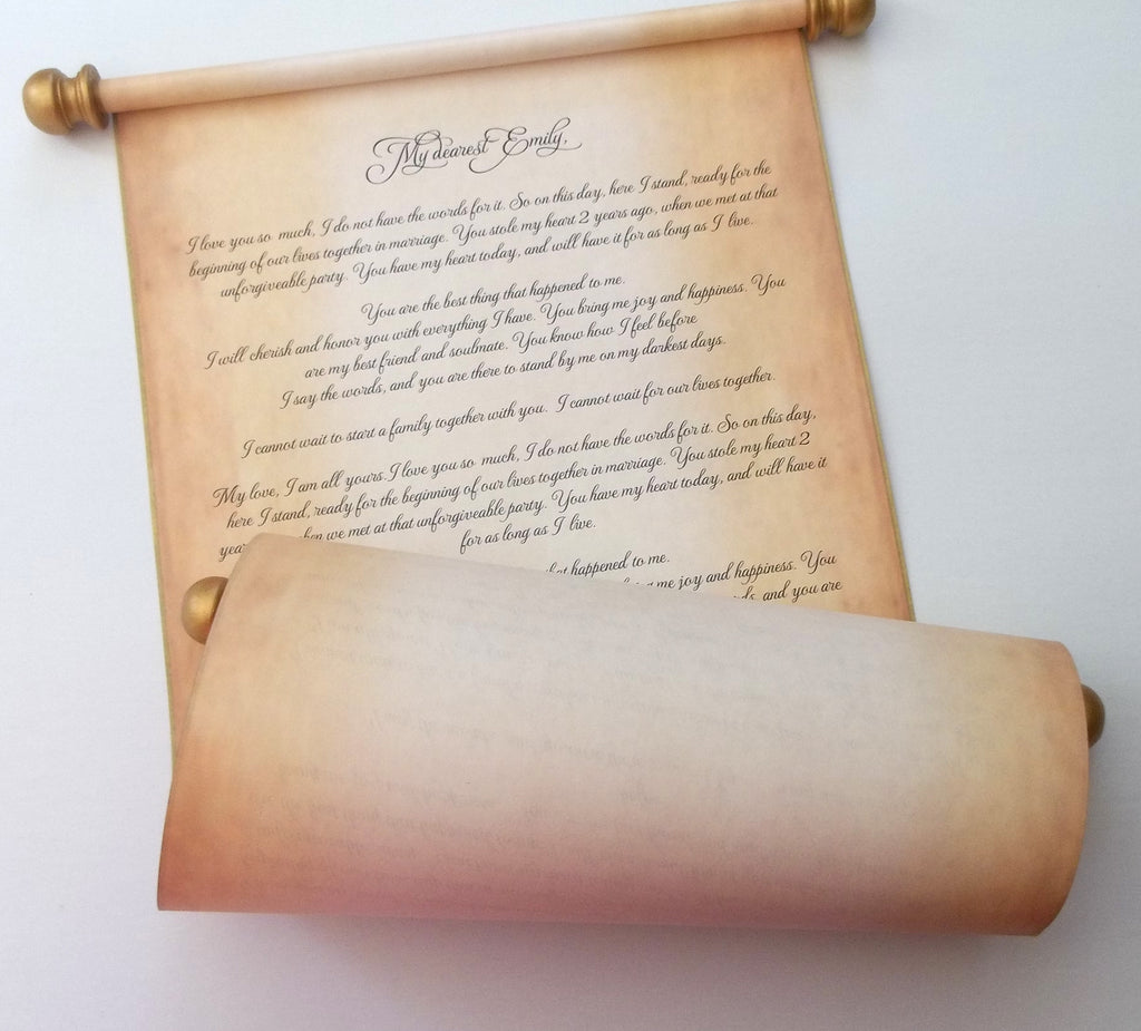 Scroll printed with your own wording, perfect for your wedding vows, marriage proposal, birthday letter, personal note of thank you, or small gift.