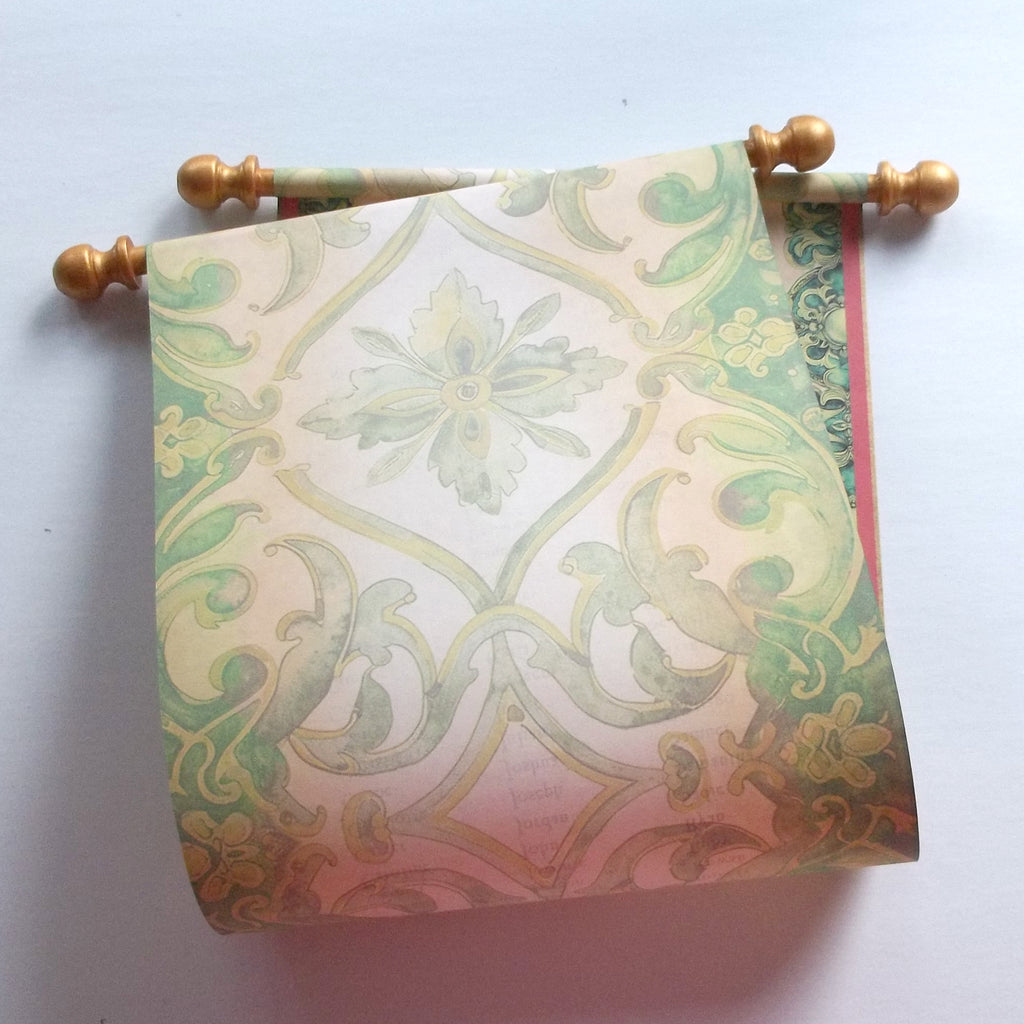 Handmade scroll with hand painted gold wooden finials and hand drawn gold paper edging. Scroll will be printed with your list - send one name or 250. Scroll will be tied with a green satin ribbon. Paper measures 8" wide by up to 20" long. Overall width of scrolls is about 10.50".