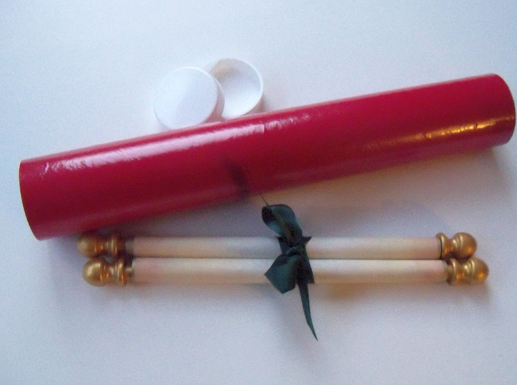 One handmade, aged look parchment paper scroll with dark green satin ribbon. Includes a red mailing tube to store the scroll in.