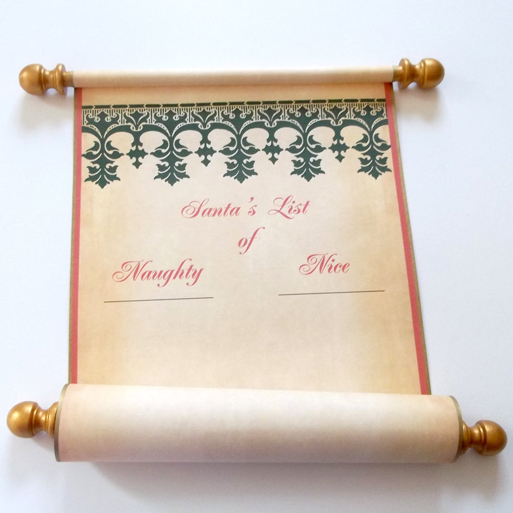Aged look parchment paper with hand drawn gold metallic edge. Width of paper is 8 inches. Length is about 20 inches. Scroll has hand painted gold wooden finials and a ribbon tied around the scroll.