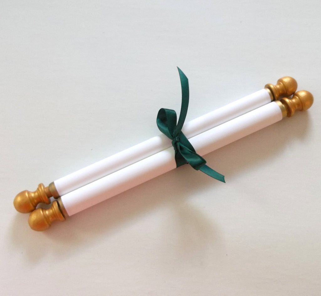 White linen paper with hand drawn gold metallic edge. Width of paper is 8 inches. Length is about 19 inches. Scroll has hand painted gold wooden finials and a ribbon tied around the scroll.