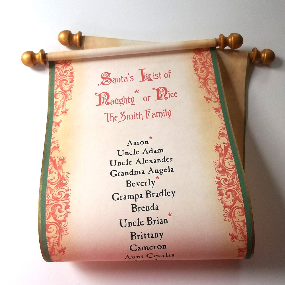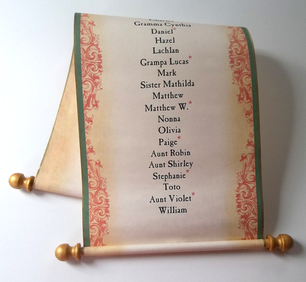 Handmade scroll with hand painted gold wooden finials and hand drawn gold paper edging. Scroll will be printed with your list - send one name or 60. Scroll will be tied with a green satin ribbon. Paper measures 8" wide by up to 20" long. Overall width of scrolls is about 10.50".
